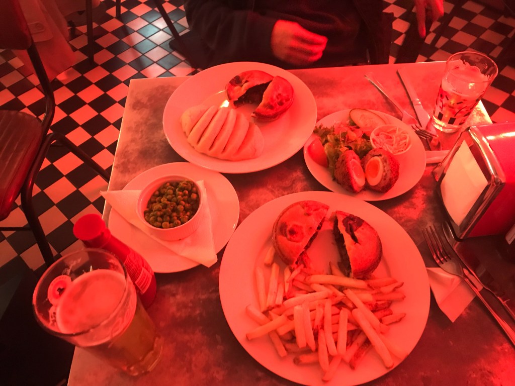 pies and chips, mushy peas, and a scotch egg @ piebury corner