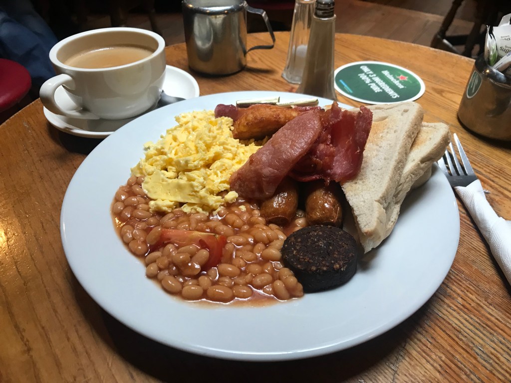 Perhaps it had been the longest day that I have had this semester. I woke up at 3:30 AM in order to make my flight at London Heathrow at 7:00 AM. I drank my first cup of coffee immediately before the flight so I would have a clear head after I took my plane nap. I drank my second cup of coffee after I arrived and had an Irish breakfast at Donaghue’s, which included an interesting black pudding composed of baked blood and herbs.