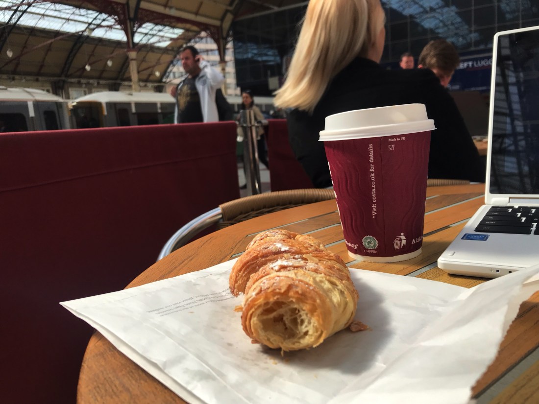 I learned from my mistake. This is my second to last day in London, and I am now sitting at a Costa Coffee at Victoria Station. Instead of ordering the bacon sandwich, I went to the Pret upstairs to buy an almond croissant before returning to Costa to buy a coffee. It is not that I enjoy Costa’s coffee more than Pret’s coffee; they both have a sort of airy and warm quality to it that invites memories of joy, but Pret did not have an outdoor seating area. Costa did have an outdoor seating area. It is 61 degrees (F) in London with a bit of its signature overcast, and I am not about to squander such a beautiful opportunity to be outdoors.